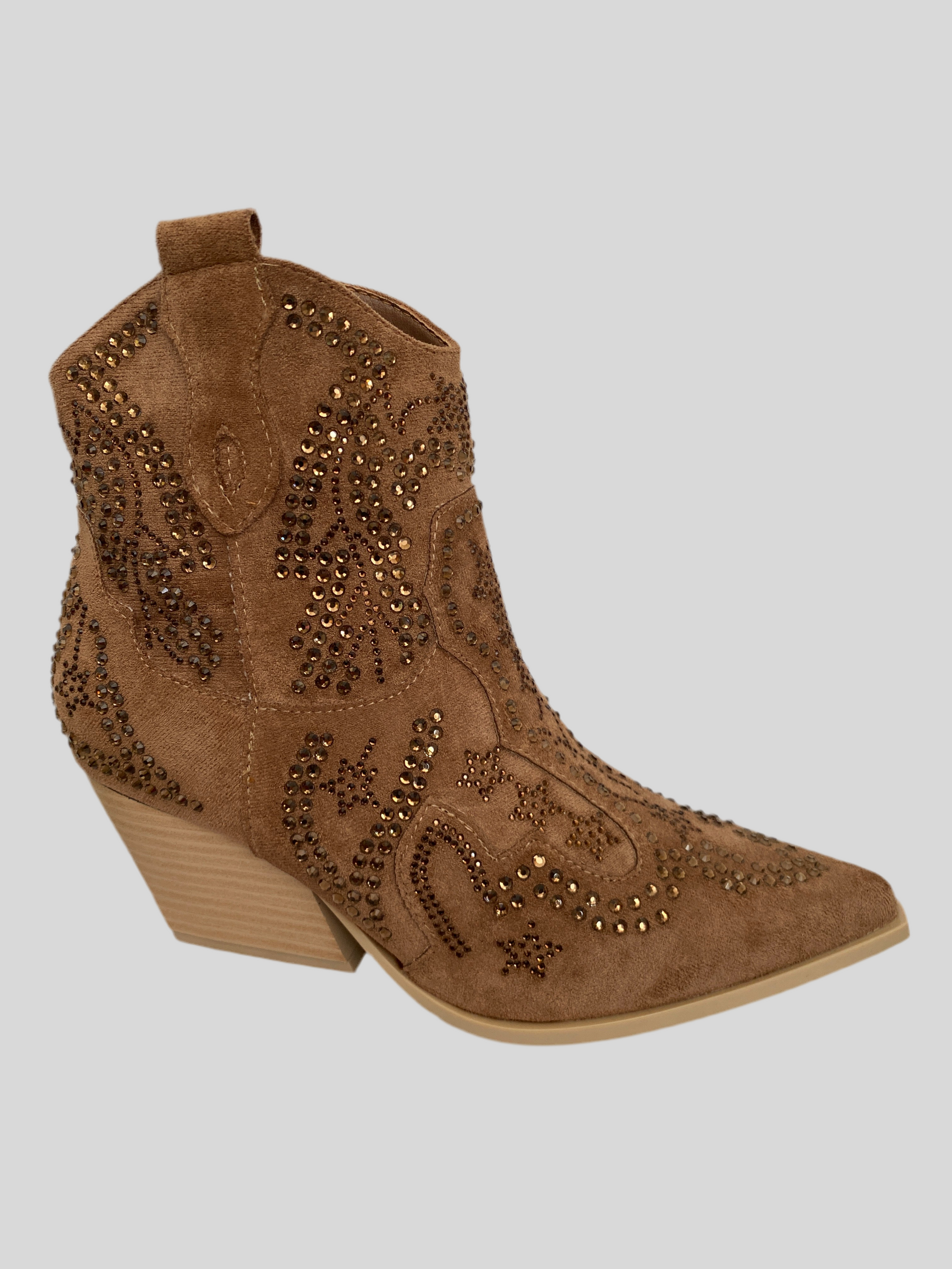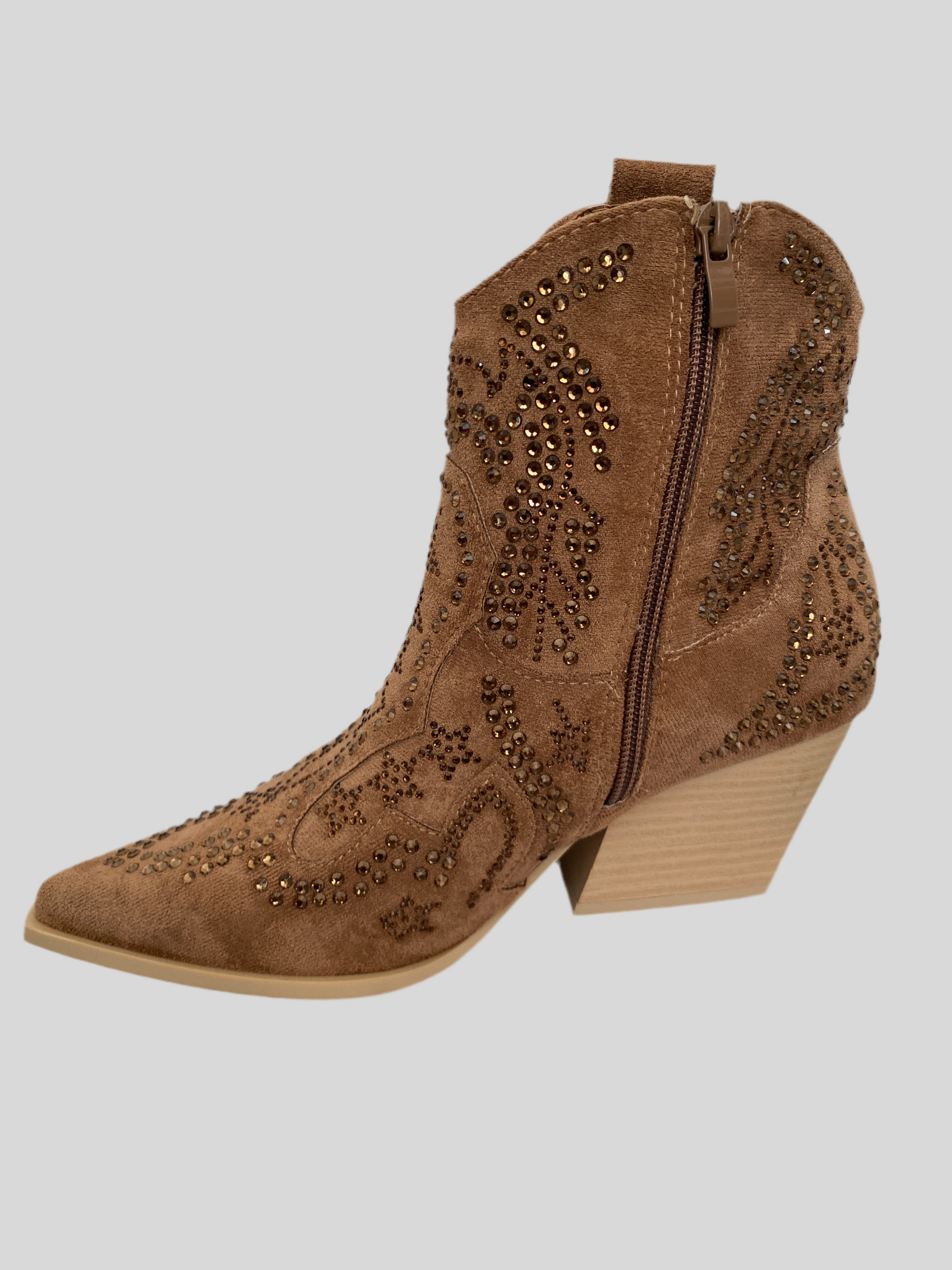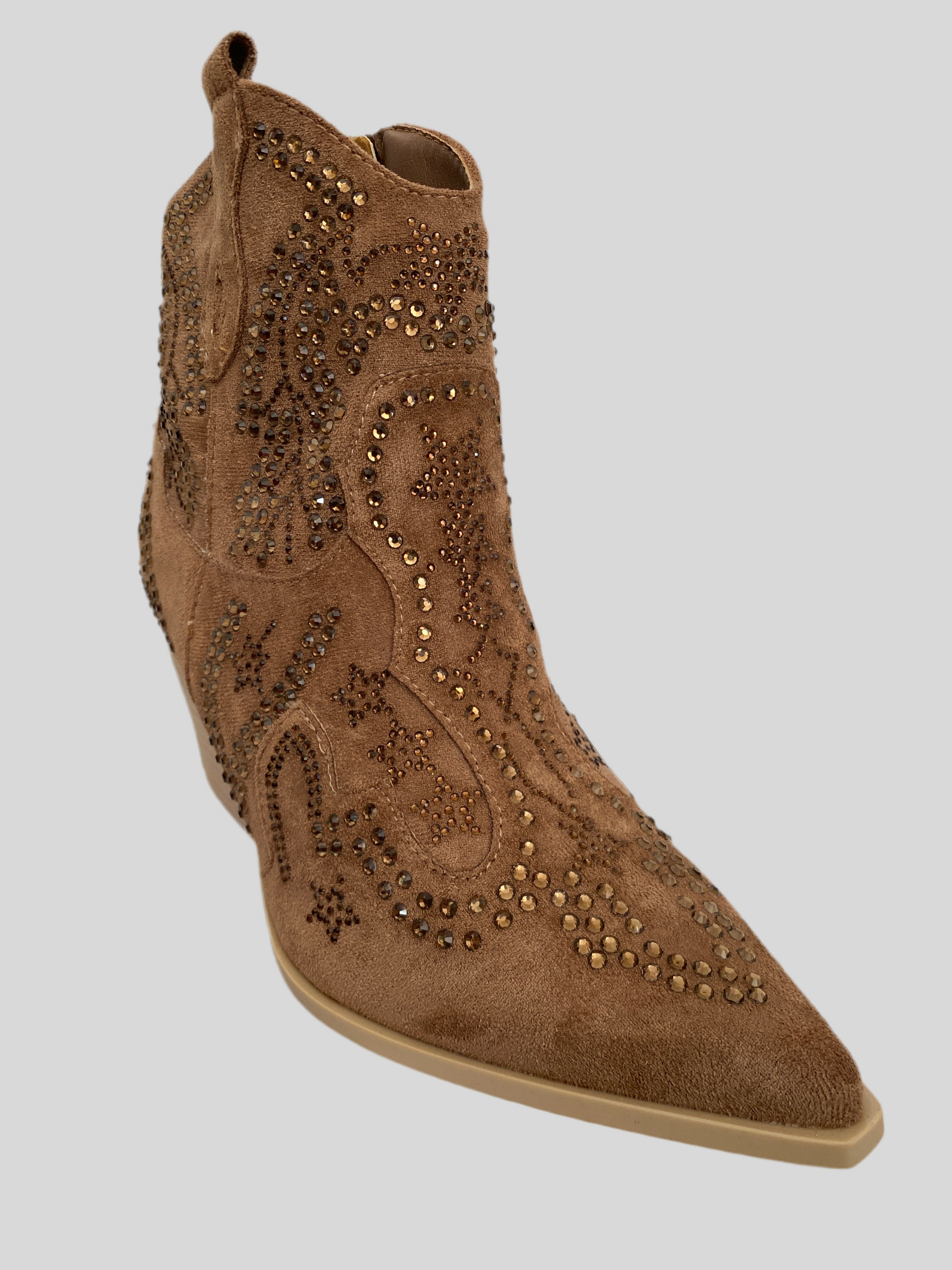 Questi stivaletti sono realizzati in similpelle, ma con un tocco di eleganza grazie agli strass tacco di 6 cm. Il morbido scamosciato color camel li rende comodi da indossare e adatti per ogni occasione. Il mix perfetto tra stile e comfort.altezza massima 20 cm