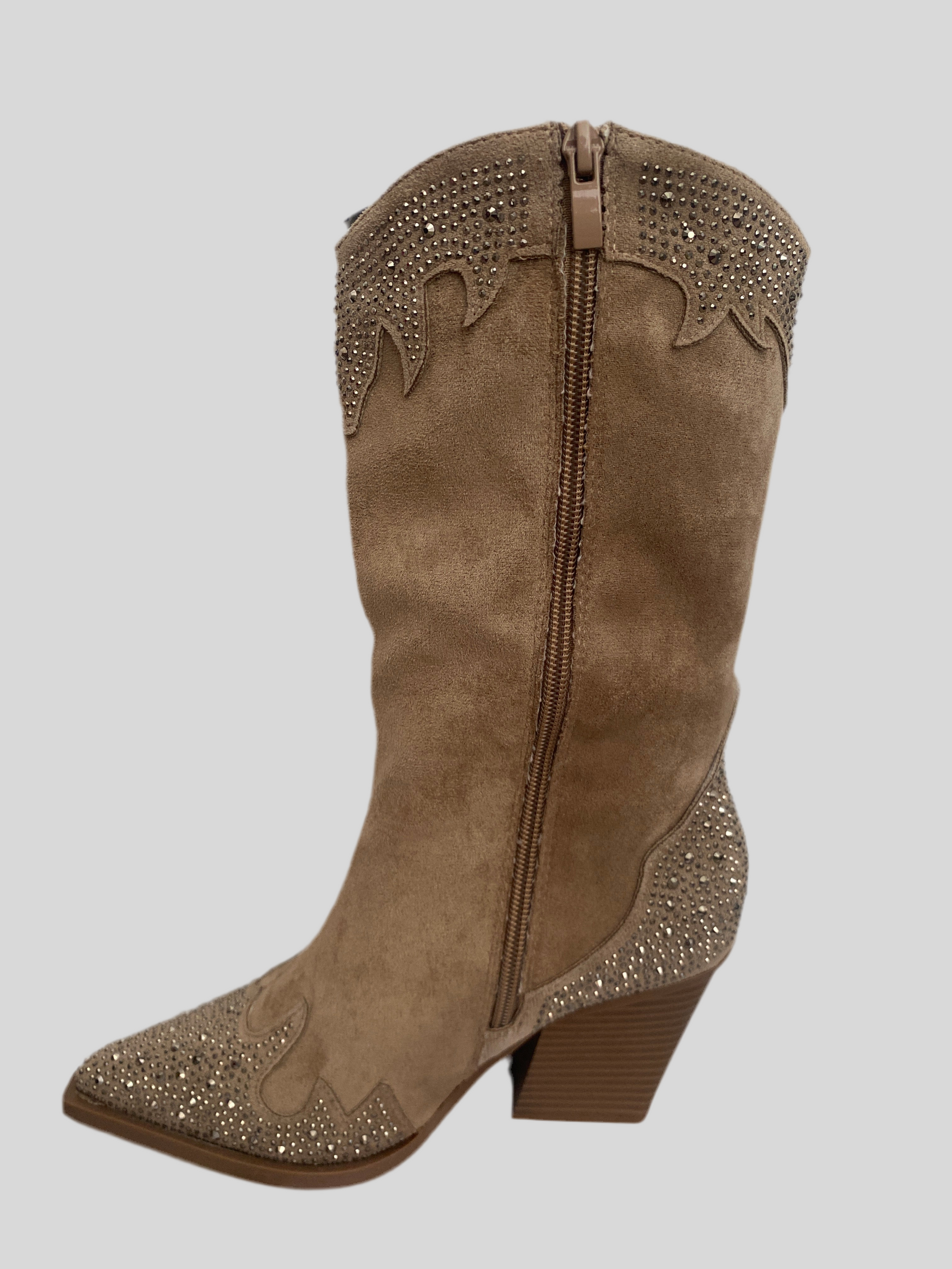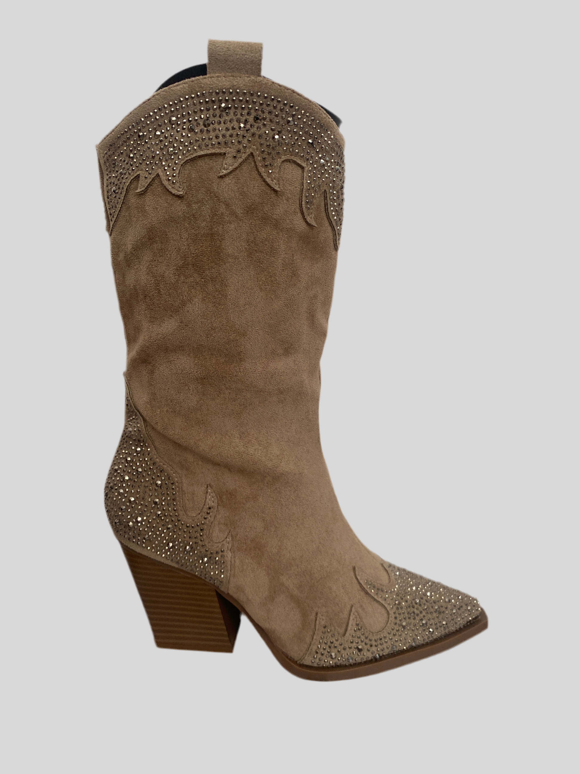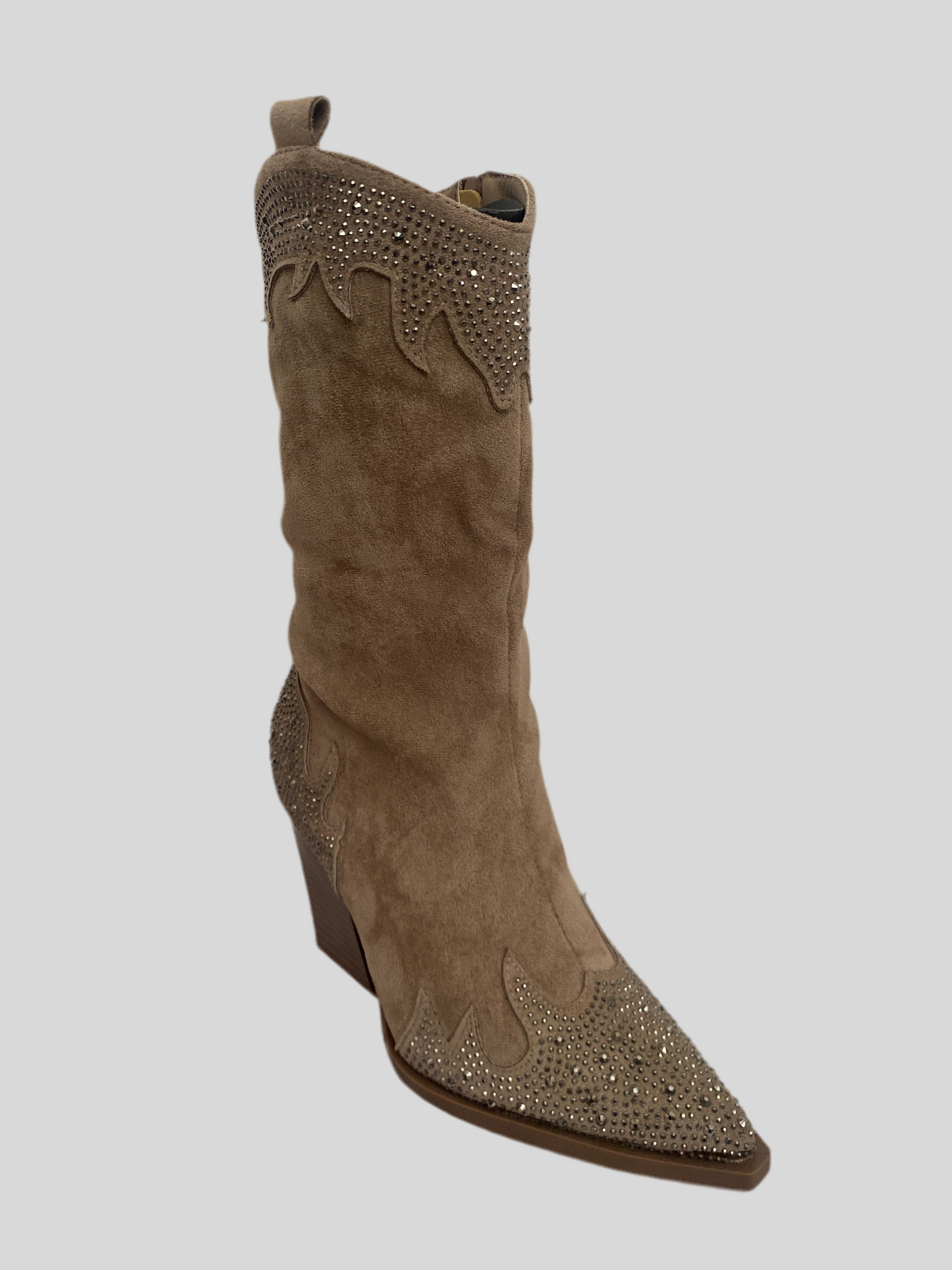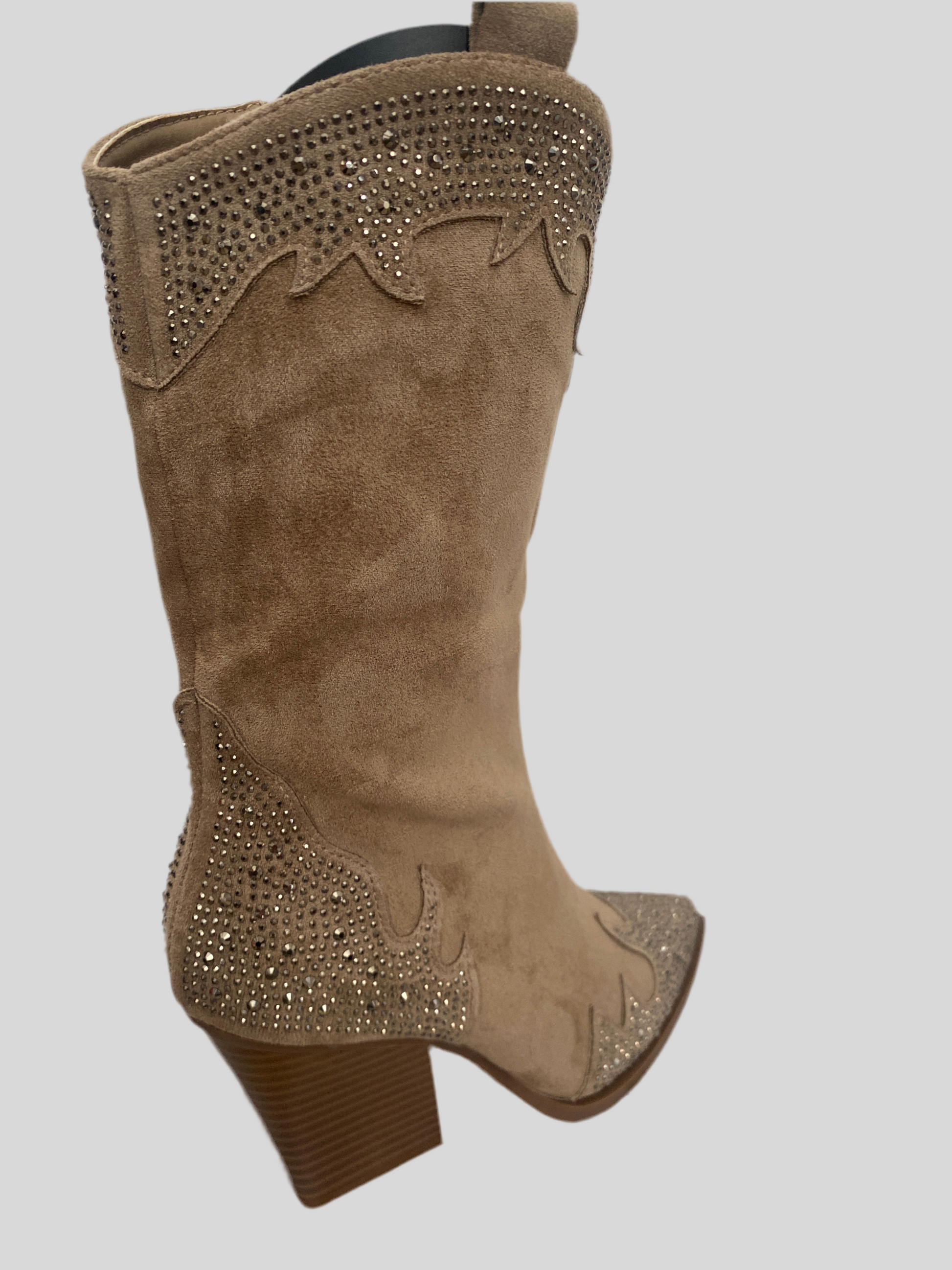 Gli Stivali scamosciati metà polpaccio in similpelle con strass hanno un tacco di 7 cm che dona eleganza e comfort. Realizzati con materiale resistente, sono perfetti per completare il tuo look con un tocco di lusso. Grazie ai dettagli in strass, sarai sempre al centro dell'attenzione.altezza massima 31 cm